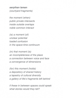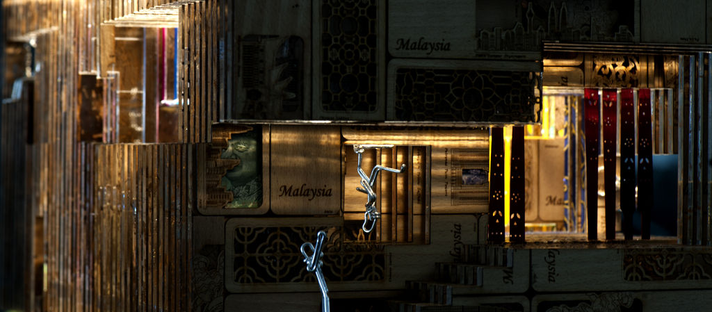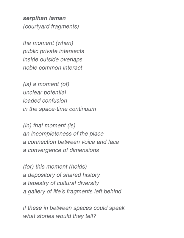 Serpihan Laman is an attempt to understand what our common ground as Malaysians might be by juxtaposing recognizable local architectural typologies and the insertion of fragments of symbolic representations that shape our collective and individual experiences within the overlapping spaces. As architects, we design in a multi racial/cultural/religious/ethnic realm so we began by questioning our understanding of ‘Malaysian-ness’. While we have a shared history, there are different perceptions of it, depending on perspective. Similarly, common threads between the kampung house, the Cheong Fatt Sze Mansion and di dalam istana maziah beyond their architectural expressions were apparent: i) a certain decorum in the treatment of public to private spaces; ii) a response to the hot humid climate in the use passive solar strategies of courtyard and verandah to ventilate and buffer. The resultant convergence of these indoor-outdoor spaces within the rich cultural contexts of each typology in the model is simultaneously appealing and absurd against the backdrop of history and religious diversity. Such contradictions can be confusing, at times provocative or merely awkward; but occasionally, there are moments of beauty in the melange.