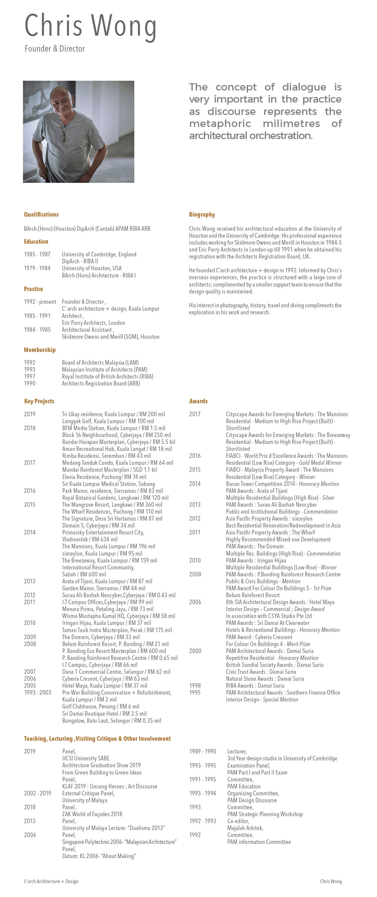 Chris Wong received his architectural education at the University of Houston in USA and the University of Cambridge in England. His professional experience includes working for Skidmore Owens and Merill in Houston in 1984-5 and Eric Parry Architects in London up till 1991 when he obtained his registration with the Architects Registration Board, UK.