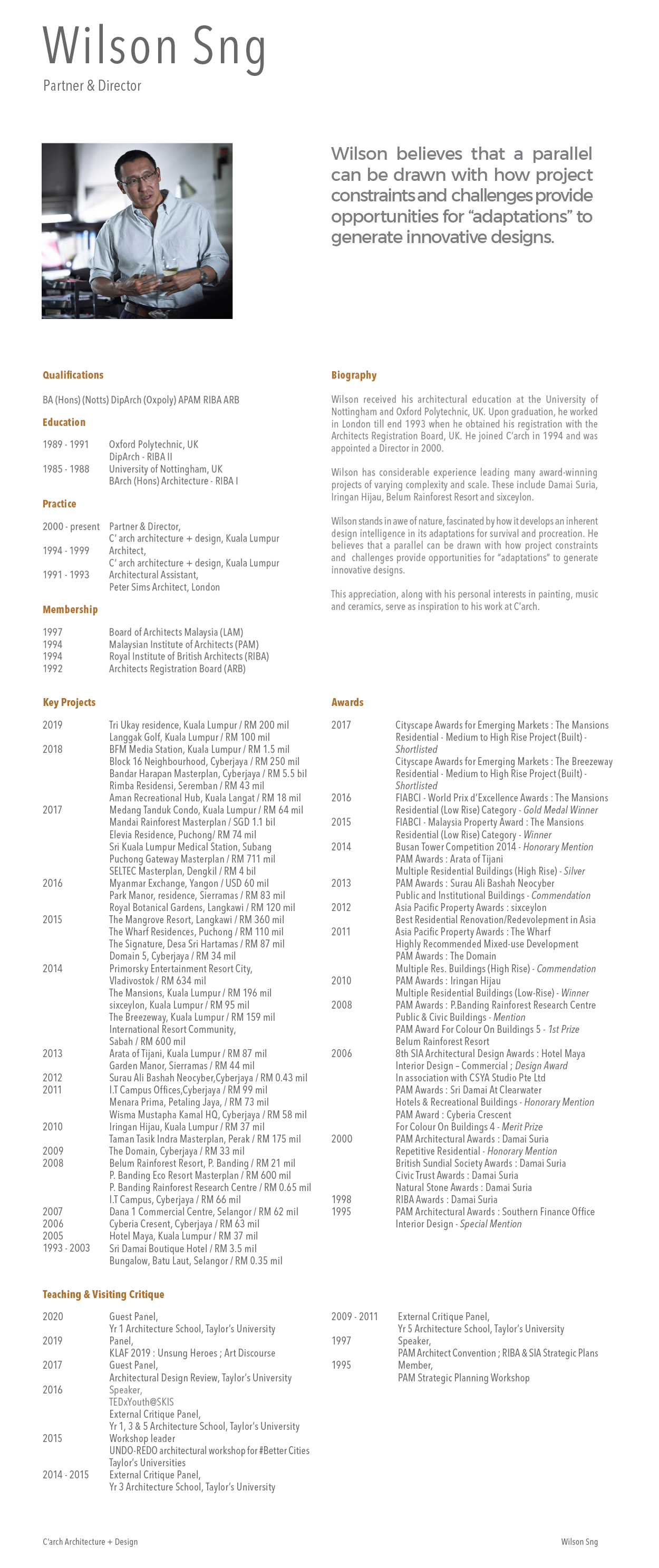 Wilson received his architectural education at the University of Nottingham and Oxford Polytechnic, UK. Upon graduation, he worked in London till end 1993 when he obtained his registration with the Architects Registration Board, UK. He joined C’arch in 1994 and was appointed a Director in 2000. Wilson has considerable experience leading many award-winning projects of varying complexity and scale. These include Damai Suria, Iringan Hijau, Belum Rainforest Resort and SixCeylon. Wilson stands in awe of nature, fascinated by how it develops an inherent design intelligence in its adaptations for survival and procreation. He believes that a parallel can be drawn with how project constraints and challenges provide opportunities for “adaptations” to generate innovative designs. This appreciation, along with his personal interests in painting, music and ceramics, serve as inspiration to his work at C’arch.