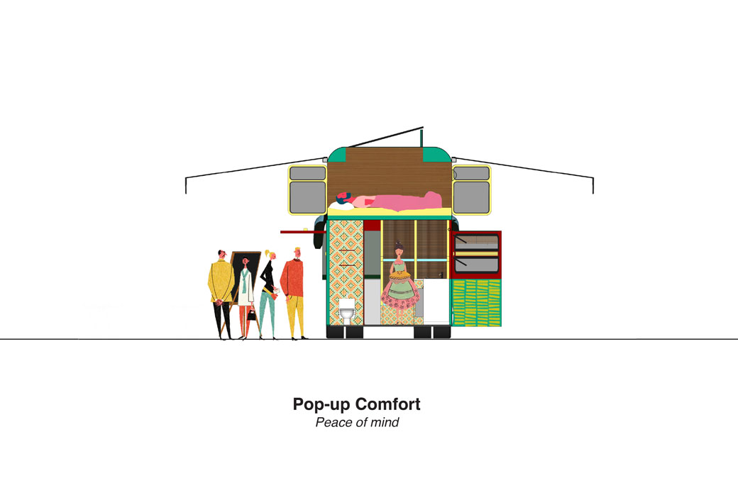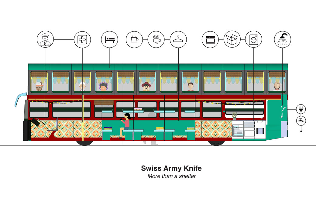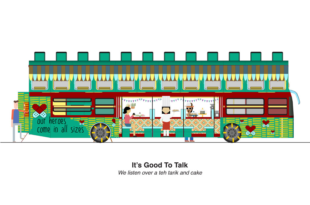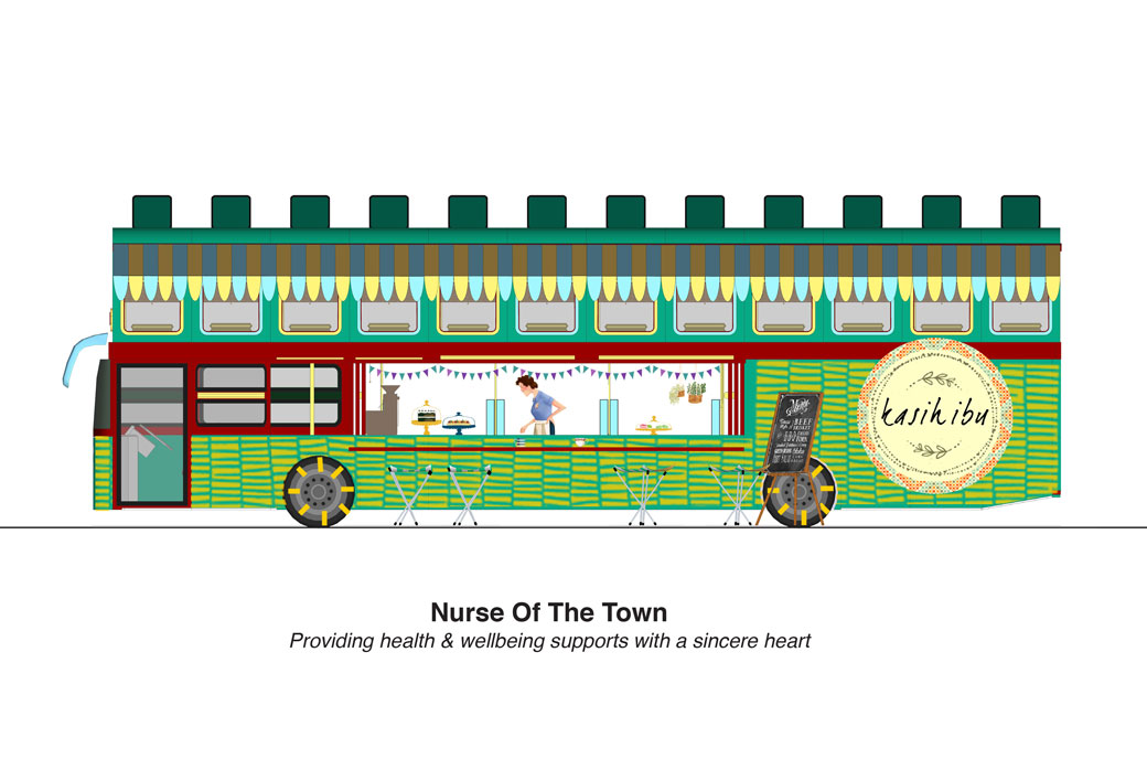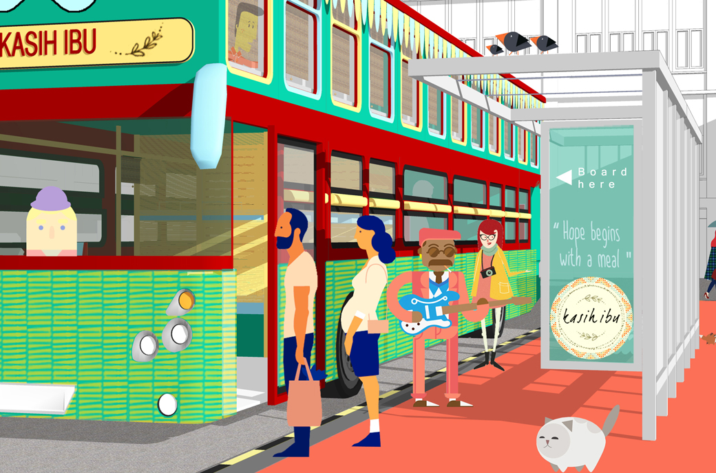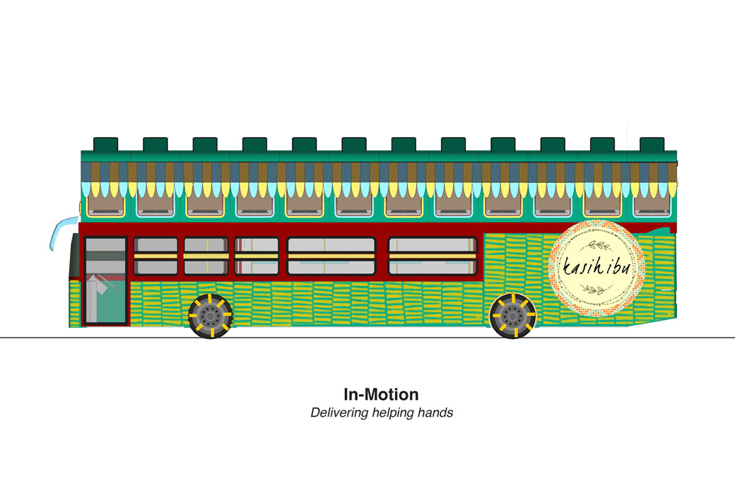Kasih Ibu offers a temporary mobile shelter rehabilitated from a standard double-decker bus. It accommodates 12 private bedrooms and additional 12 beds available by converting the bus seats. It has a complete shower and toilet facility accessible from both inside and outside, a kitchen, a washer and a drier, area for a chat and a café selling tea and cakes donated by moms. During the day, Kasih Ibu does awareness campaigns and charity drives at KL’s malls and at public gathering areas. During dusk, Kasih Ibu offers a pick-up for the homeless in area where there is the most need; bus stops at Chow Kit, Kotaraya, Sungkai, Masjid India and Masjid Negara. Kasih Ibu will then plug into city’s infrastructure and draw on public sport facilities, public squares and mosques for shower/toilet and overnight parking facilities. Kasih Ibu offers much more that simply housing. It provides integrated support hubs, free food, advice and information on permanent housing, income, job and education. Free basic medical care, counseling and legal advice will also be provided by a team of professional volunteers. This creates an opportunity for meaning engagement through social and community integration that helps the homeless back on their feet again.