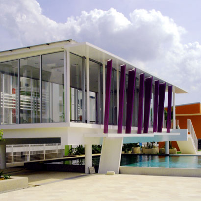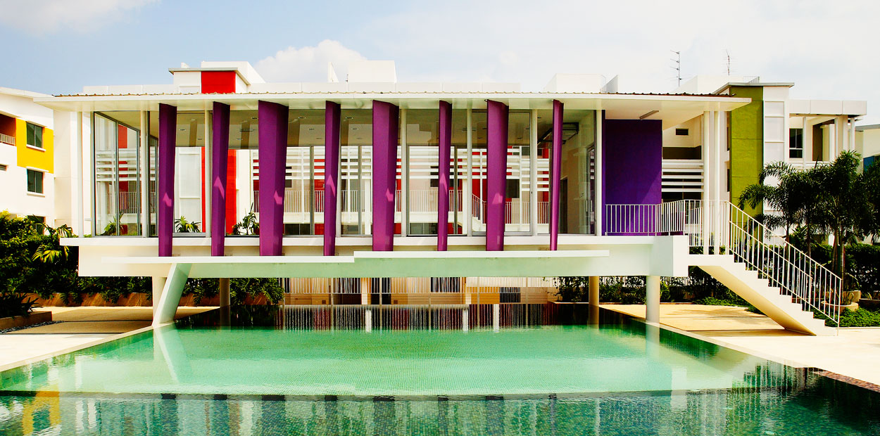 The embellishment on the front of the building are a series of precisely angled vertical brise soleil fins which do double duty as open down pipes for rain water. The open pipe is much more suitable for Malaysia because they are easier to maintain as they do not get clogged with leaves. There is also a poetic element : as water flows down the pipes on a rainy day, we see nature in action.