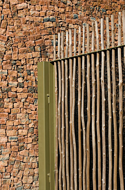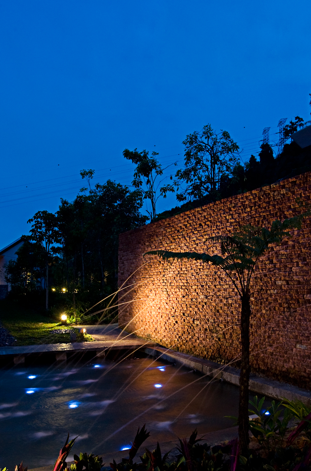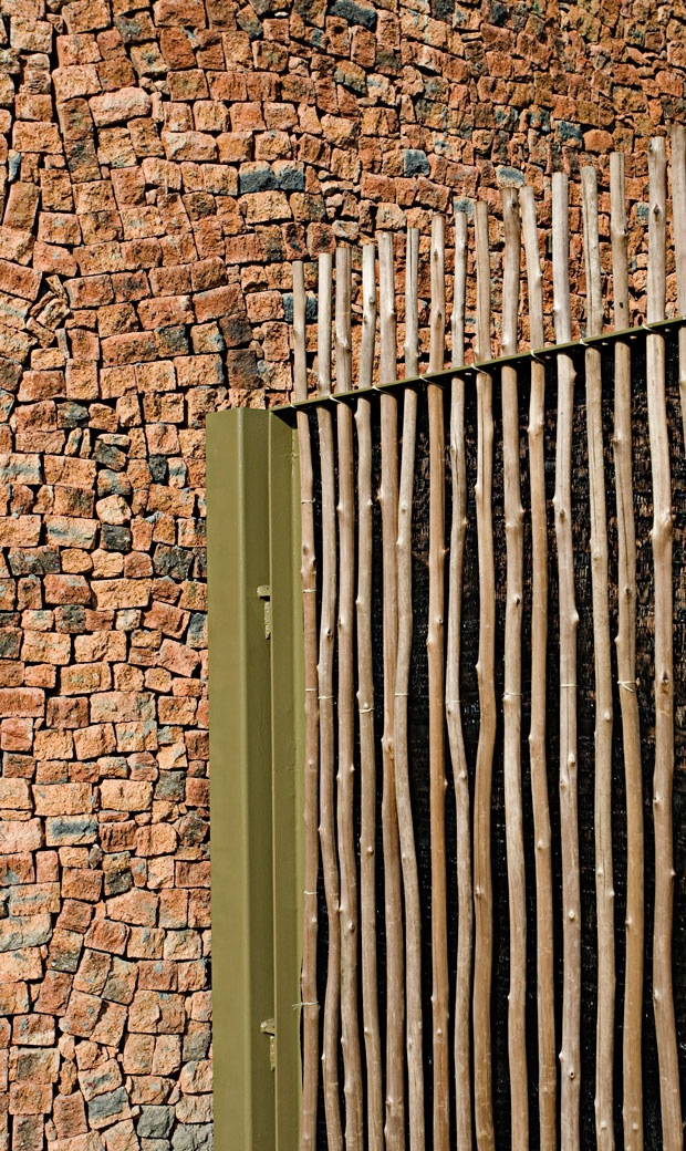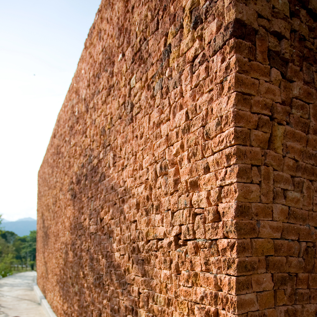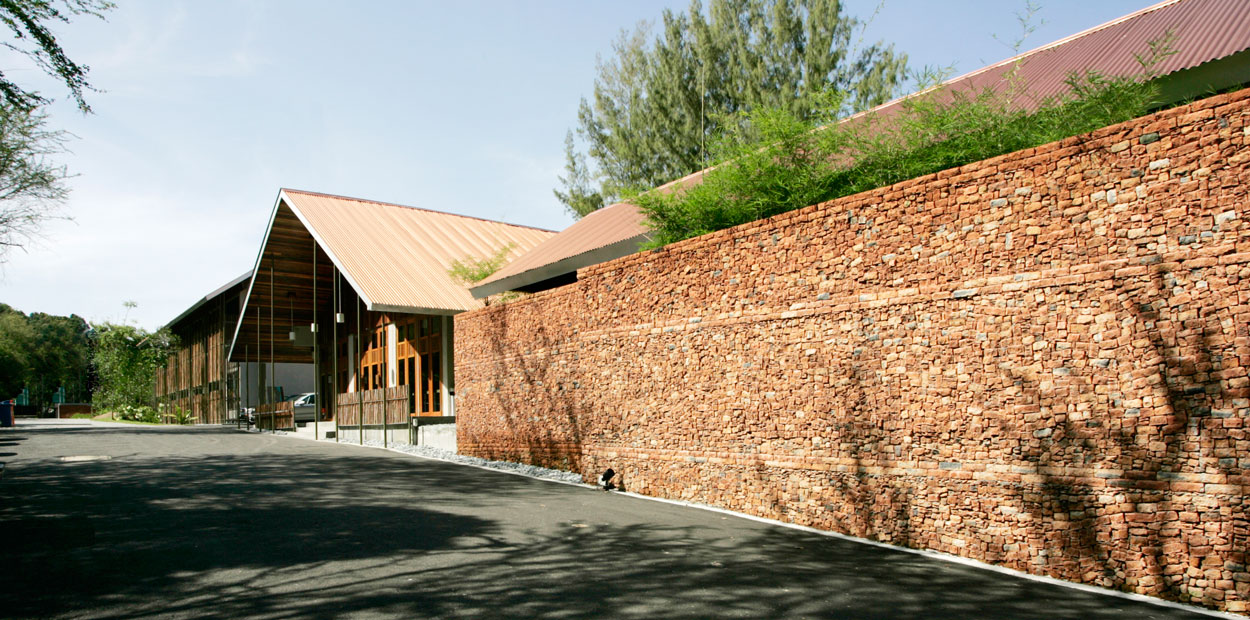 The Huruhara feature wall was built using bricks from the demolition of an existing structure instead of transporting them offsite. Huruhara means confusion in Bahasa Malaysia and is an apt name for this striking wall.