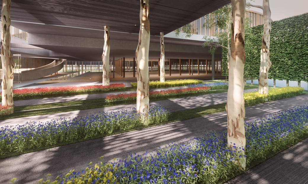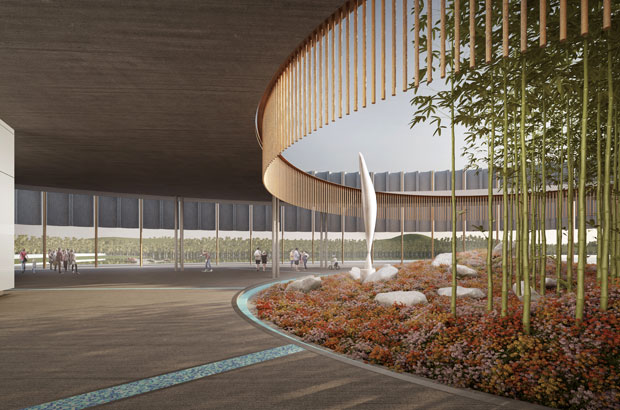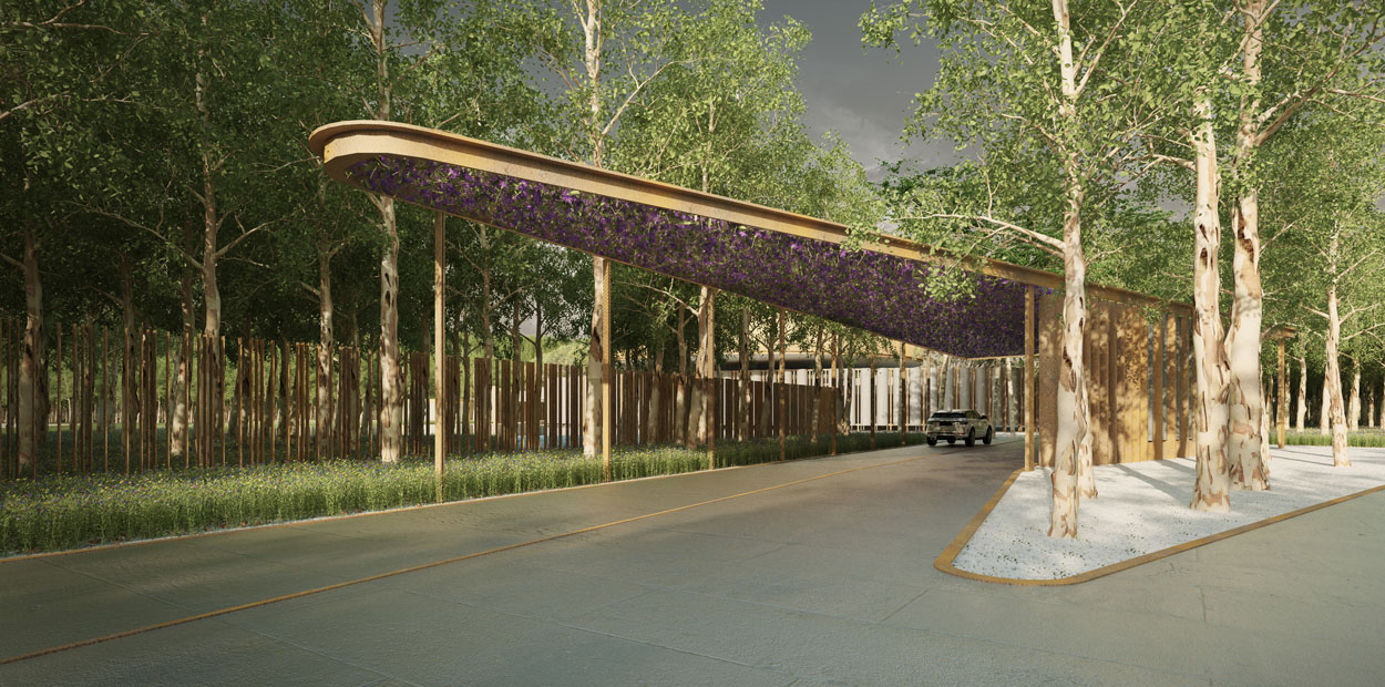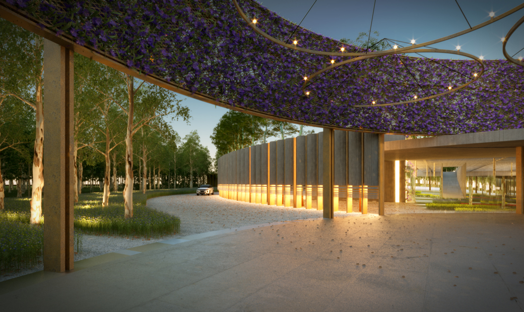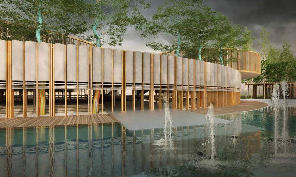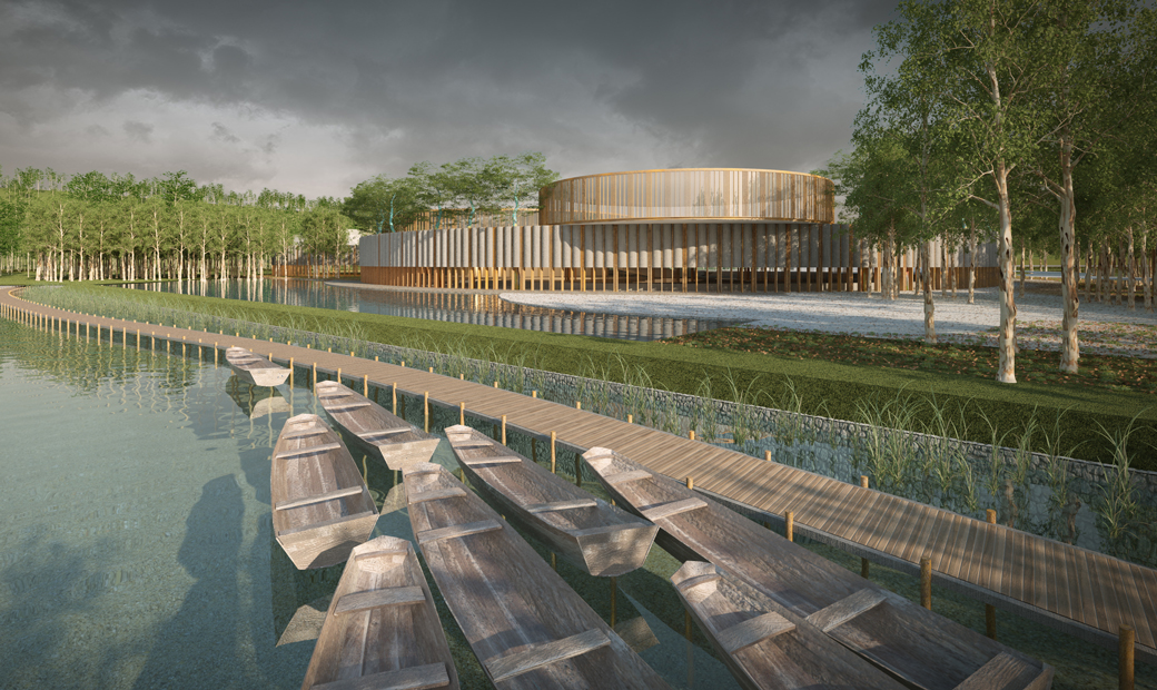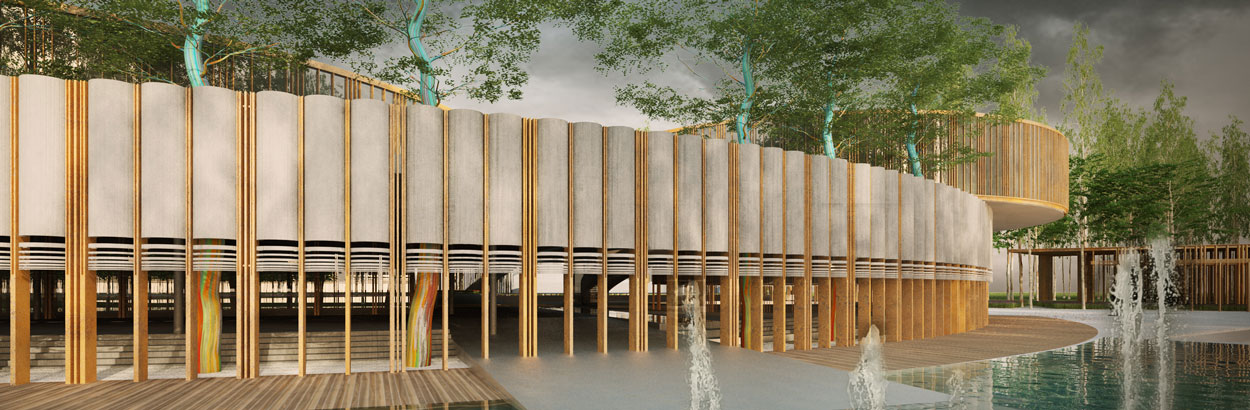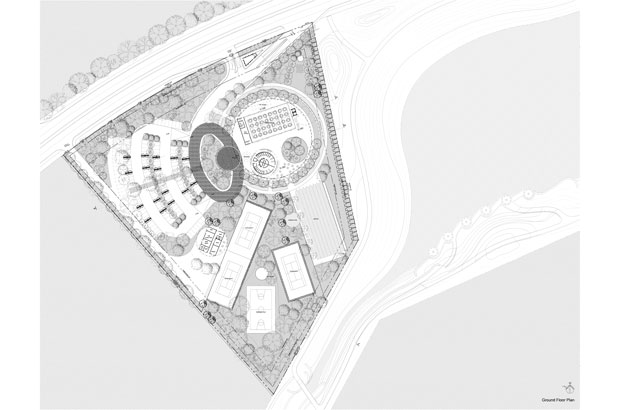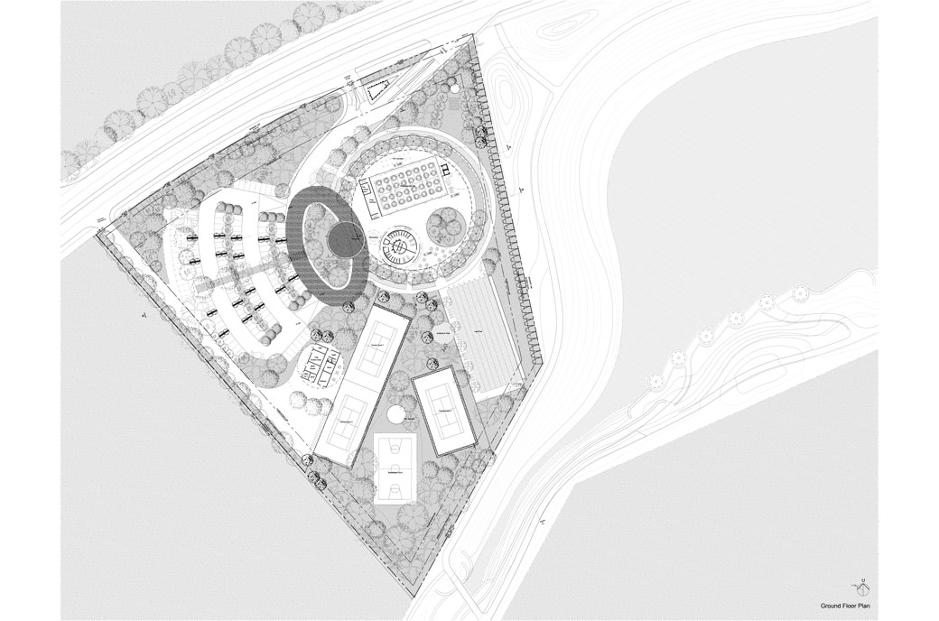 The outer-most circle is designed as a non-structural screen within the landscape to define an ‘inner’ compound comprising a rectangular multipurpose hall, a circular courtyard and the reception. Simplicity in volumetric play of curves and interstitial thresholds provide varying vistas as one moves around.