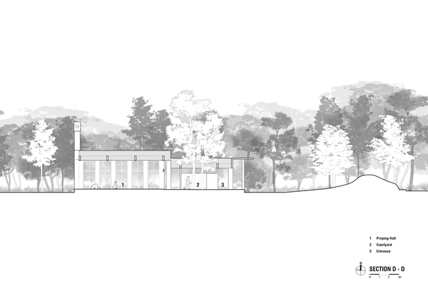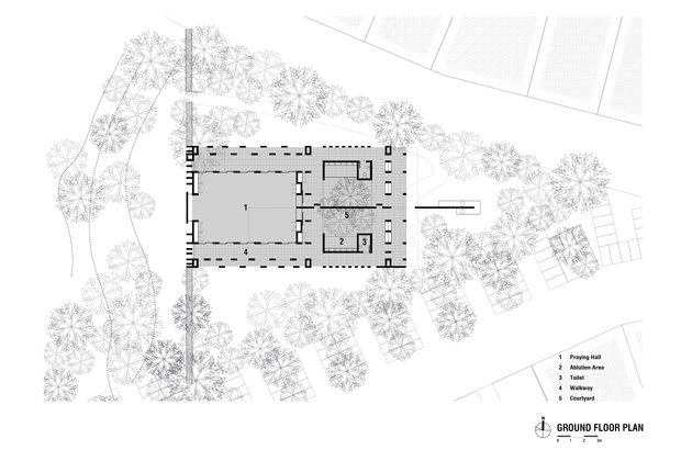 This simplicity in plan is reflected in the representation of the building. Materials employed are brick & plaster, stripped away of all adornments or components, where fenestrations are mere gaps in walls, providing a facade which responds to where openings or privacy are required. A symbolic minaret marks its intended use as a place of worship, refuge and activity centre for the Muslim community around.