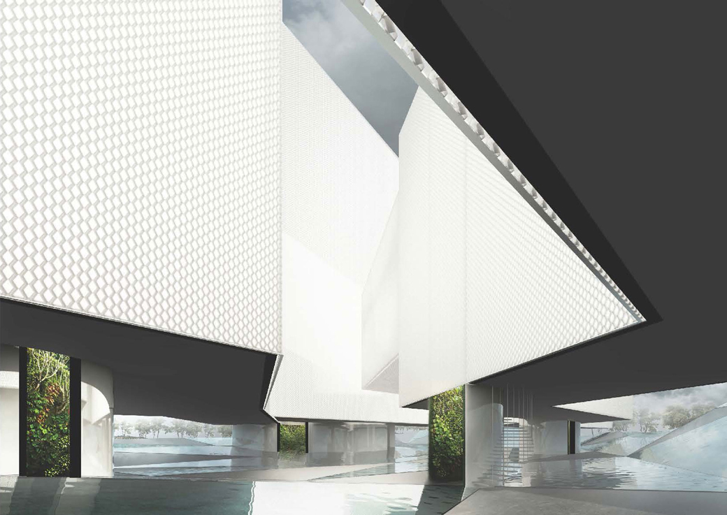 Perspectives are negated as in Chinese art, by an undulating ground plane connected to the park. The museum does not sit on a horizon. Rather, it is lifted above on a series of semi circular piloti that punch through the sky, painting the vast undercroft with light, awash with different intensities, providing the space for sculpture, auditoria and socializing. The light invites you and enter into it, rising into the building.