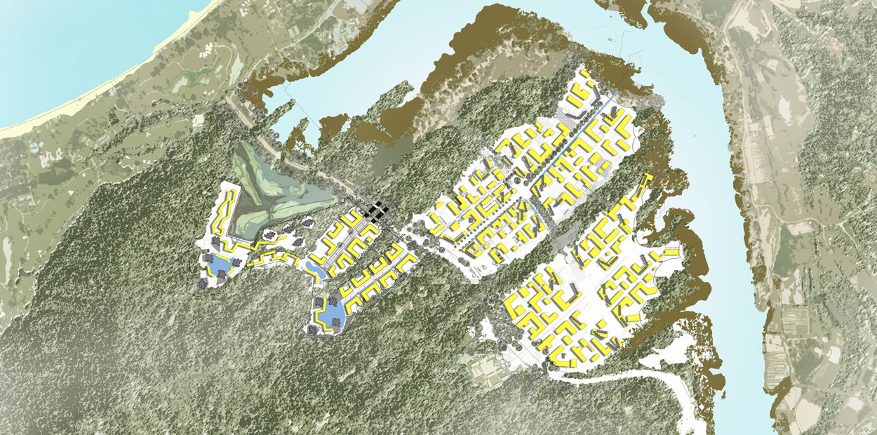We have developed 4 distinct architectural products for the proposal: "towers" providing high-rise living, "city-blocks" arranged on a formal urban grid, "street houses" giving the residents the oppurtunity of owning grounded property and "golf terraces" situated at the west of the site providing resort living adjacent to the new golf course.