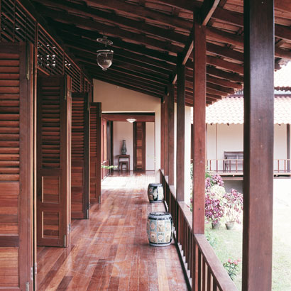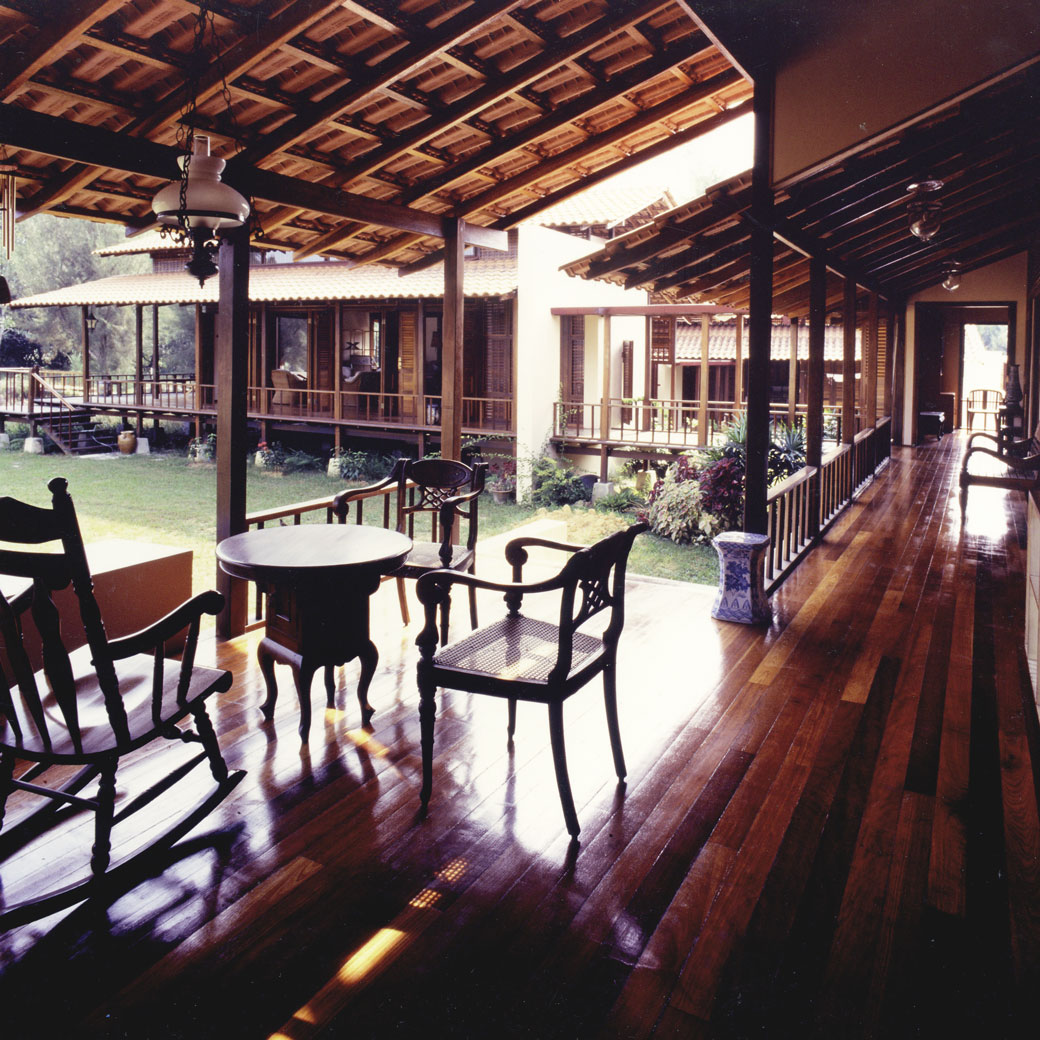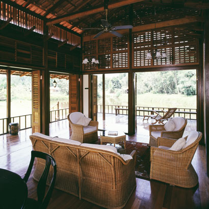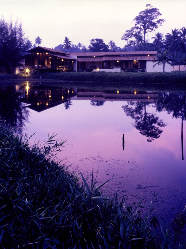 This timber house comprising a cluster of three distinctly separate but linked pavilions, sits lightly on a 3.5 acre site, which is a typically Malay orchard surrounded by the sea, a delicate belt of mangrove, the village cemetery and artificially created ponds. The dining space engages the ground, while the living pavilion is raised off the ground and encompasses the formal entrance to the house. A bridge in a small garden connecting the living space with the pavilion which houses the bedrooms and study. This pavilion is detached from the public spaces and enjoys the intimacy of open baths set in private gardens.
