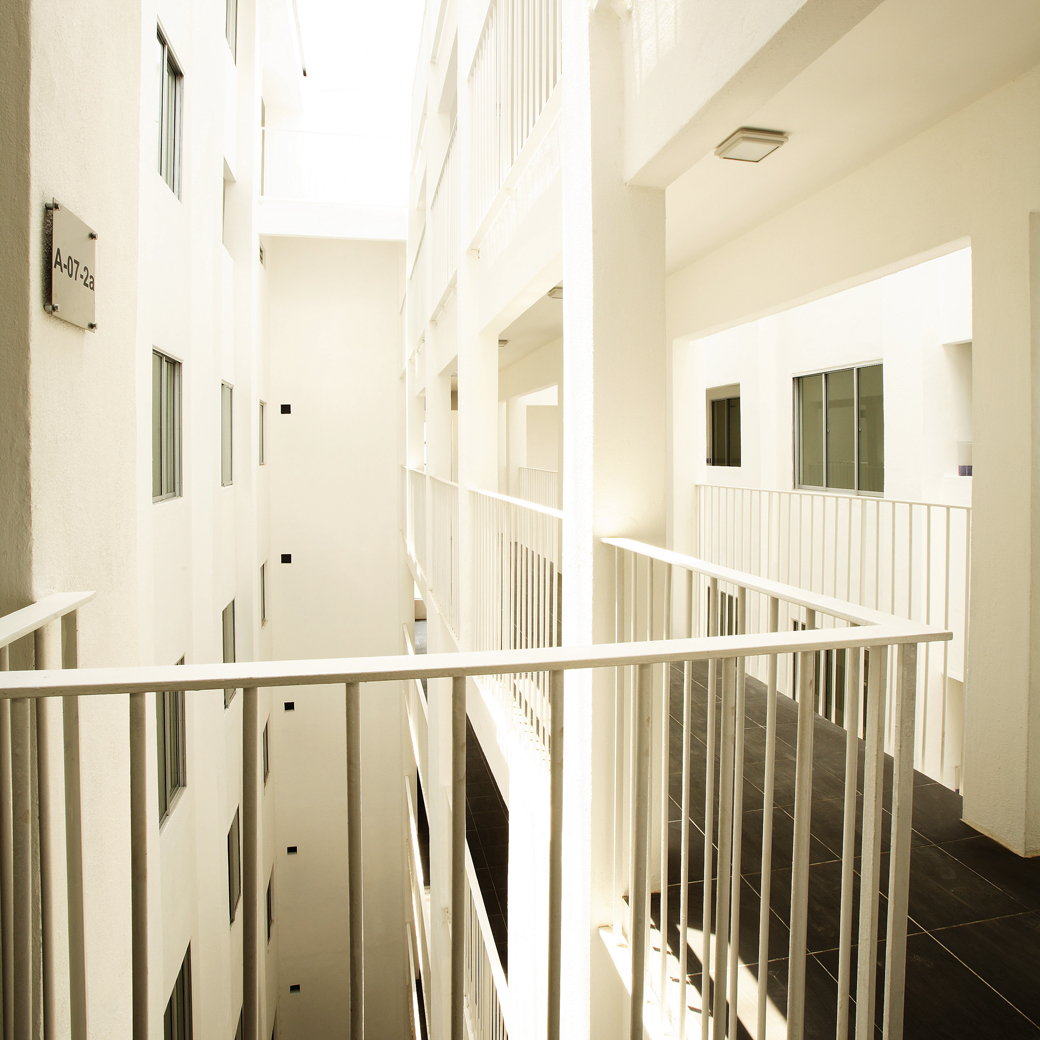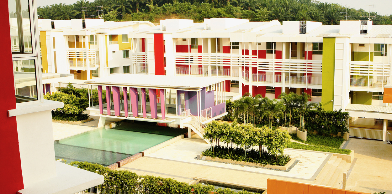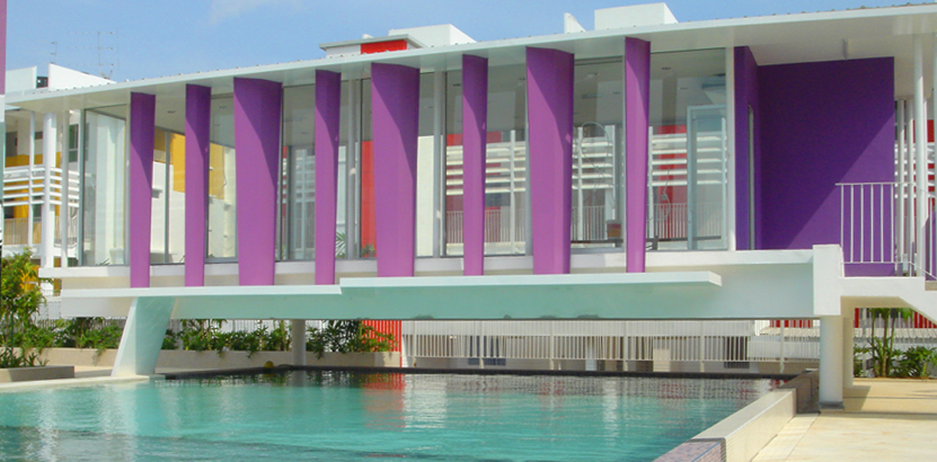 This condominium development focuses on providing good public spaces to complement the private spaces. The dwellings are arranged around a communal hub which is a suspended garden. The facilities – multifunction hall, swimming pool and gymnasium, open courtyard and a meditative Islamic prayer pavilion – are situated within this garden.
