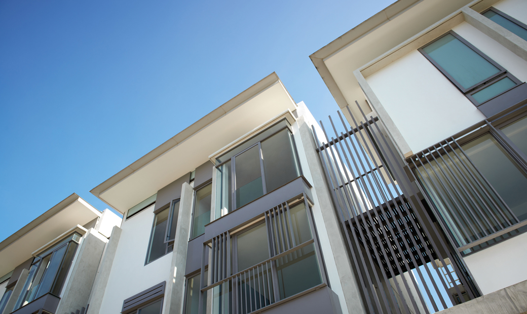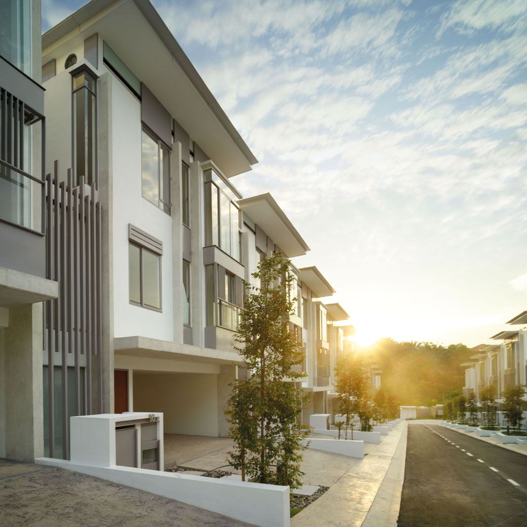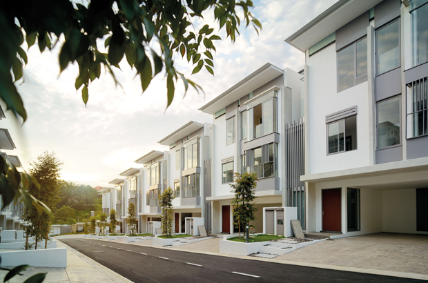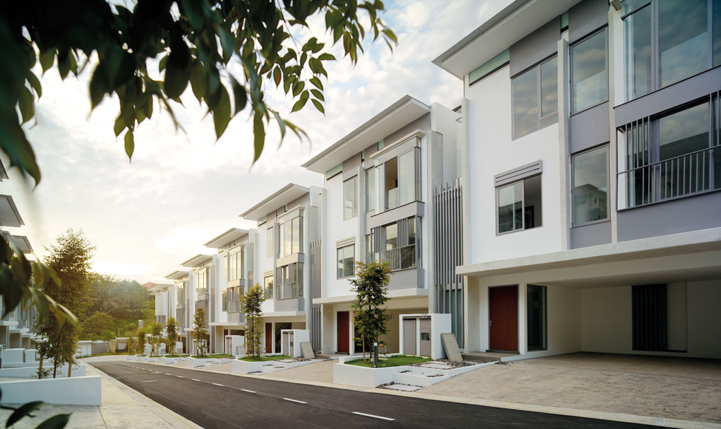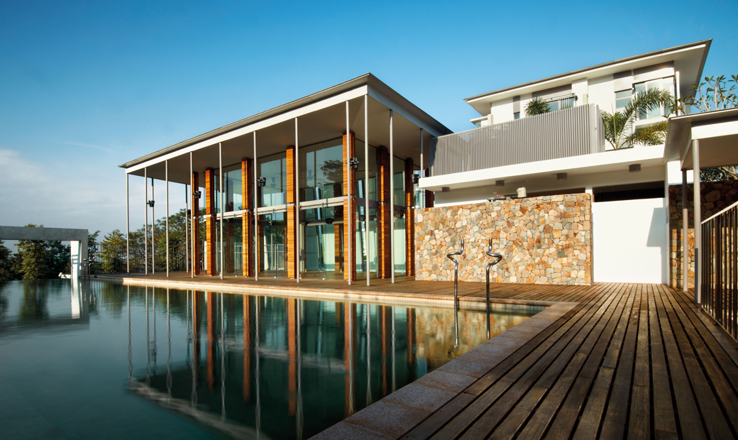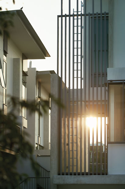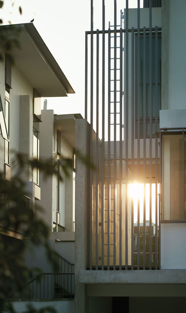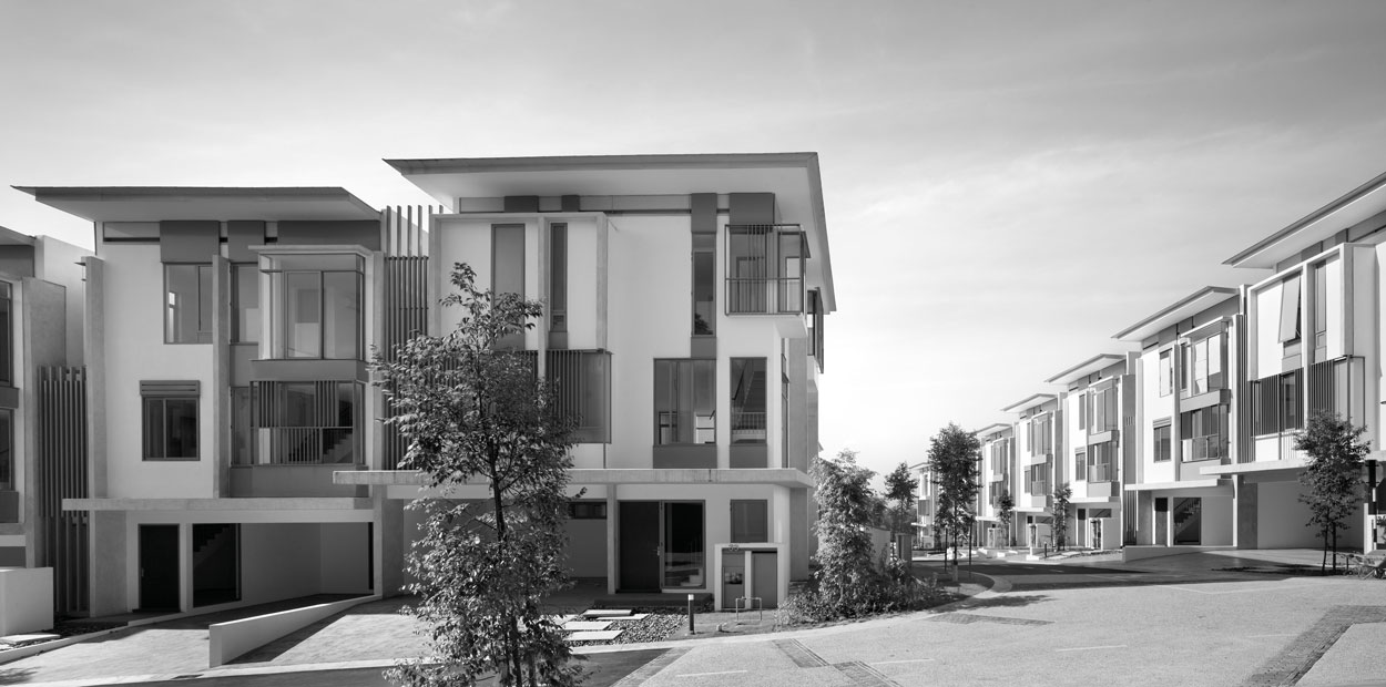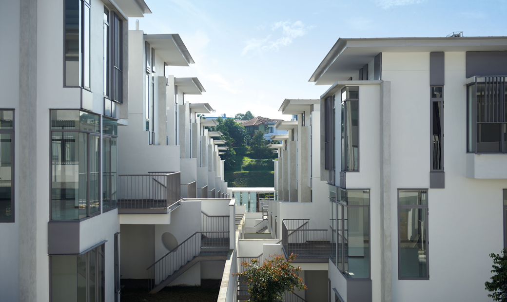A palette of fair-faced concrete, glass and aluminium screens finish these which provide comfortable tropical homes whilst achieving the required development density of 12 unit/ acre.