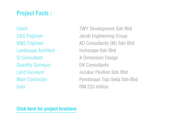 Located in Mont Kiara, TWY is a 51-storey serviced apartment tower comprising of 484 duplex residences. It comprises of 600sf, 800sf & 1,400sf dwellings which provide distinctive, compact and fully-fitted urban residences which enjoy a unique spatial experience made possible by its fully duplex configuration for all units.