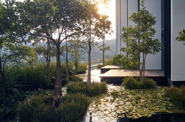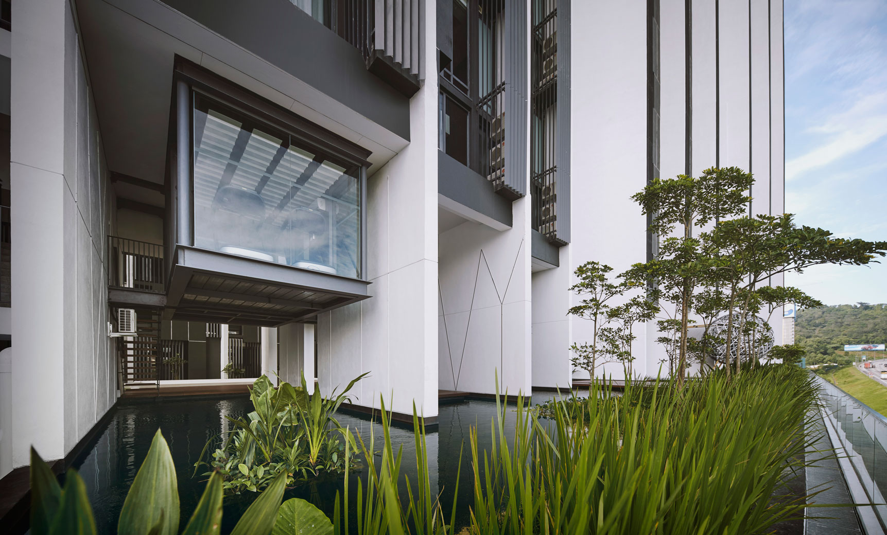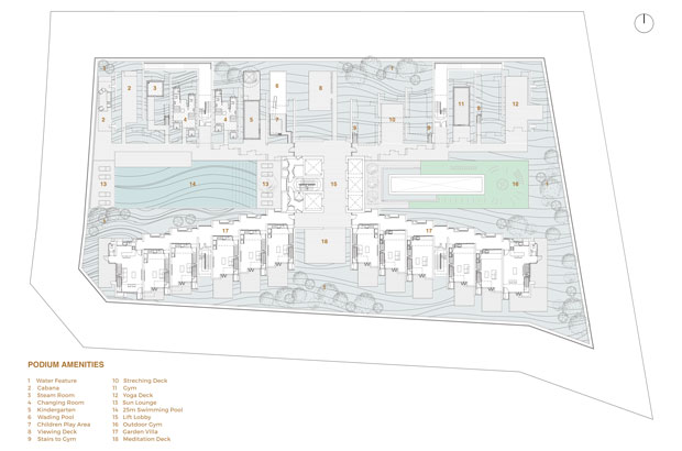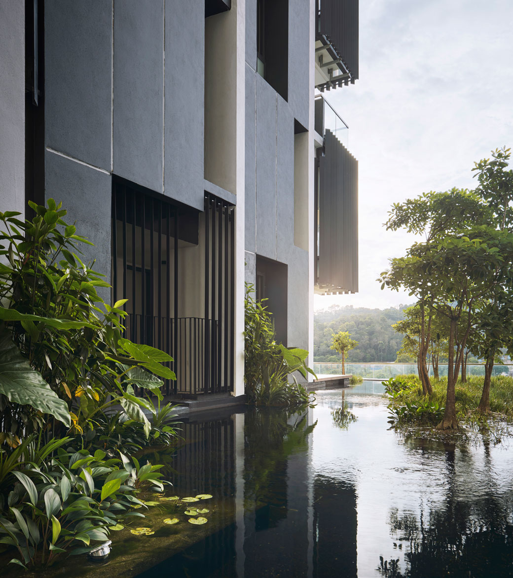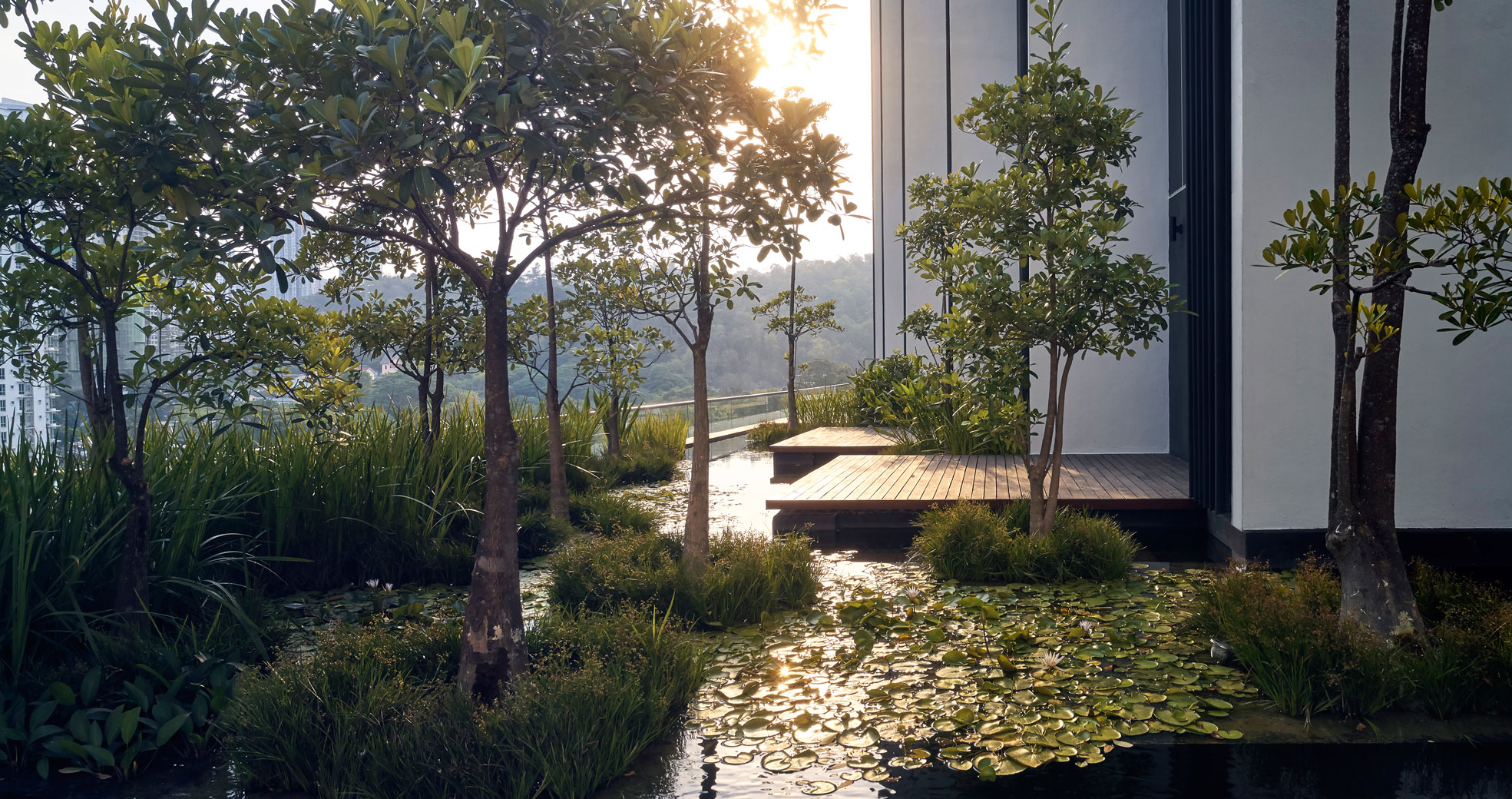The tower is positioned on top of a 0.9 acre self-cleaning bio-filtration pool which forms a waterscape of reeds and wetlands amongst the swimming pools. The rippling surface of this water body not only creates a serene, yet dynamic canvas to place its various facilities such as the gym, swimming pools, cabanas and various communal and private waterside terraces, but it also facilitates evaporative cooling to these spaces.