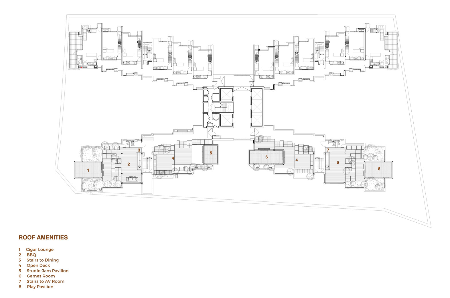 A sky lounge at the top of the tower with 360° panoramic views, provide a dining room, AV suite, cigar lounge and viewing & entertainment decks for the exclusive use of residents.