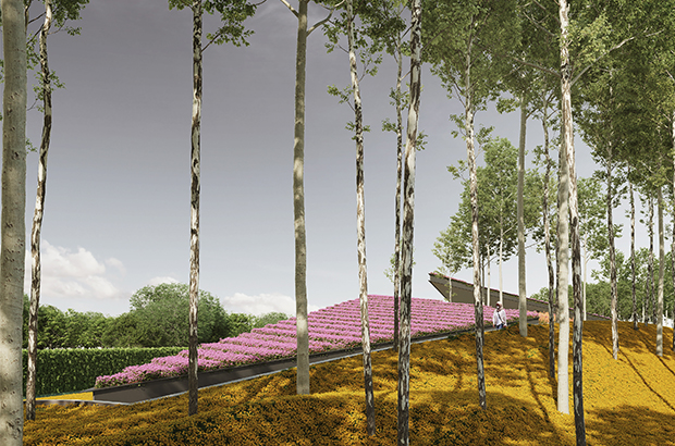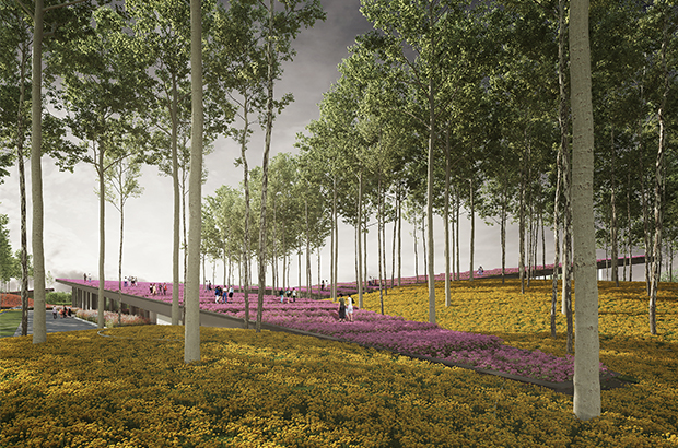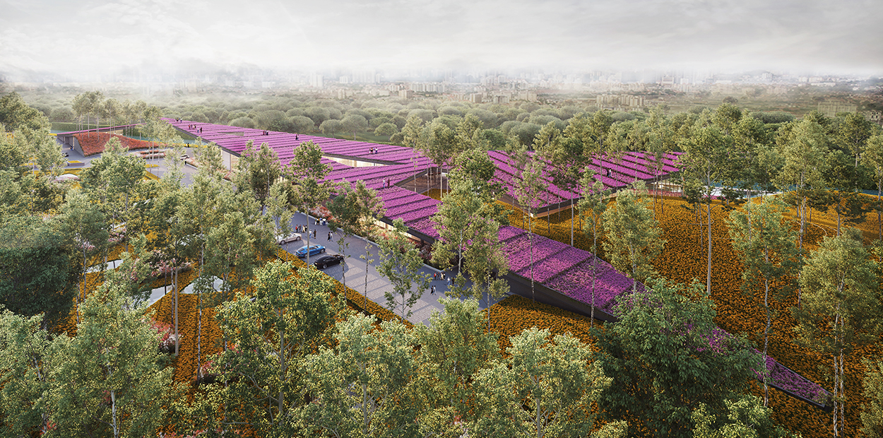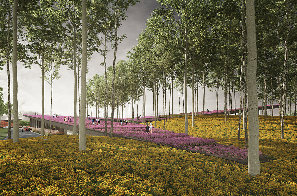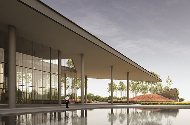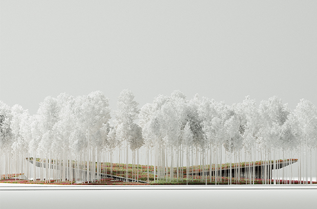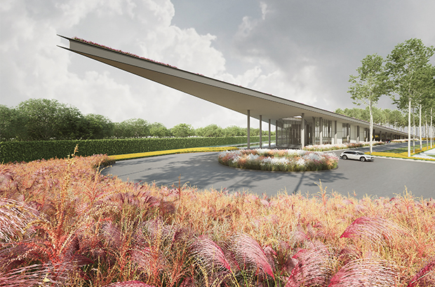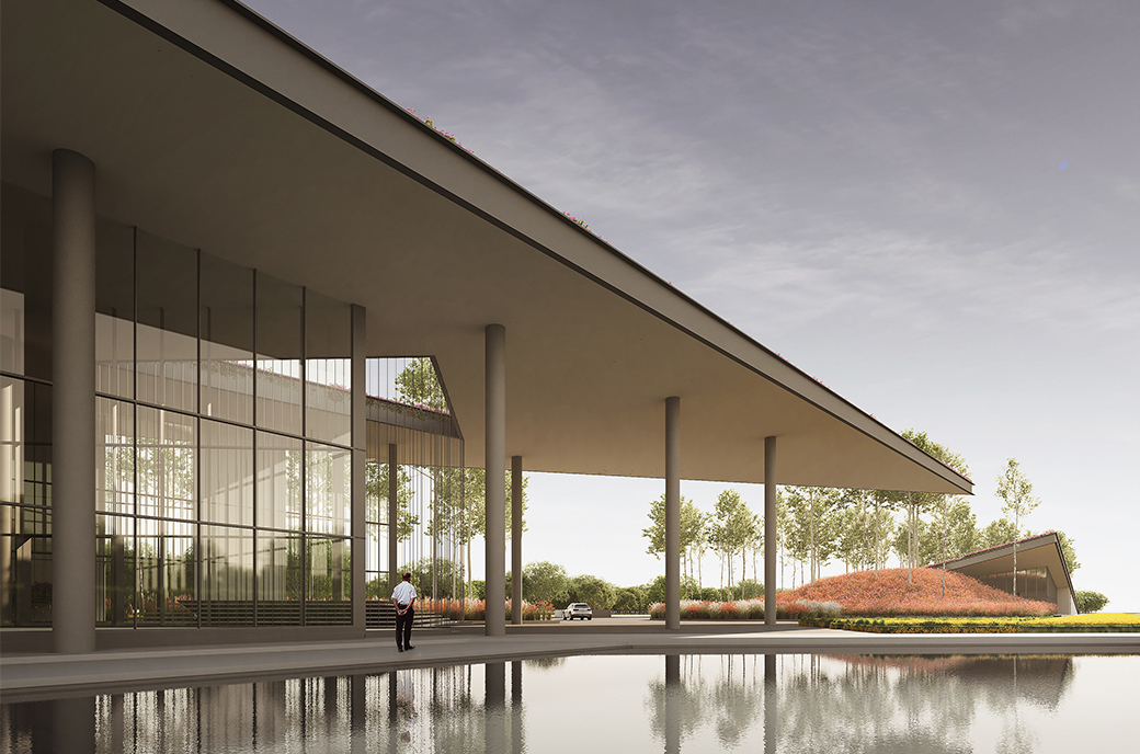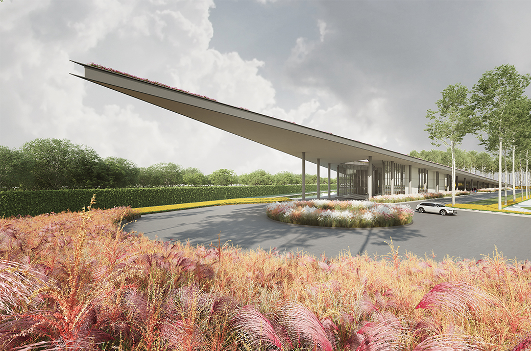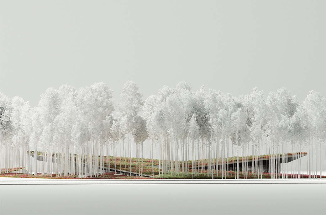 ‘Located on a flat plateau, the design intends to break out from the horizon by creating a protrusion that extends from the ground, creating an architecture that is both geometrically expressive and yet in harmony with its greens surrounding.’