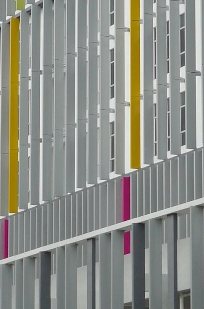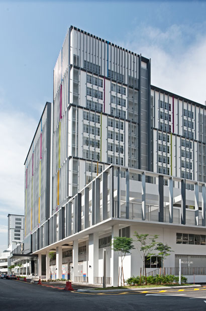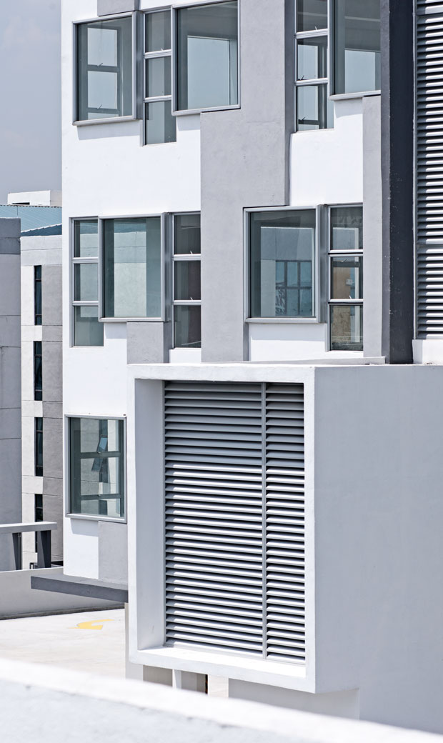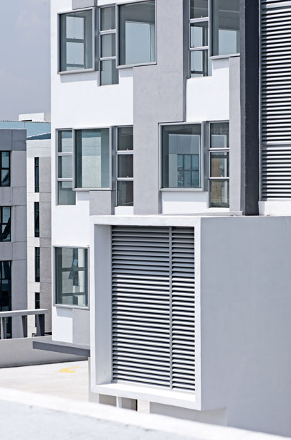 This high-rise commercial development comprises two 15-storey towers sitting on top of a 200-metre podium. The podium houses a series of retail units and car-parking facilities with communal gardens on the roof. The building is located at the centre of an existing business park and is visible from the North Klang Valley Expressway (NKVE). The eye-catching facade consists of a series of three to four-storey vertical brise soleil fins, equally spaced but stacked in a staggered fashion, with accents of highlight colours.